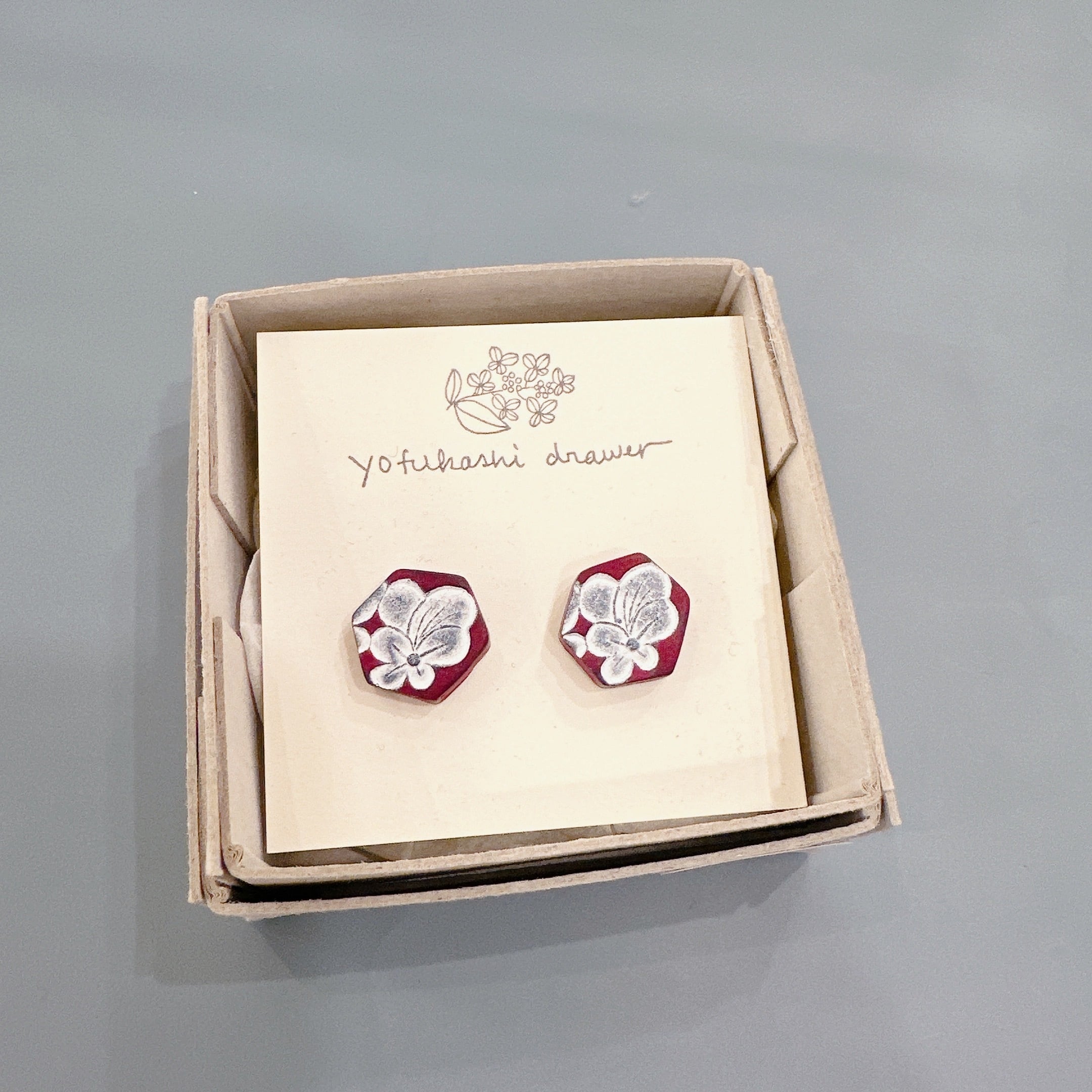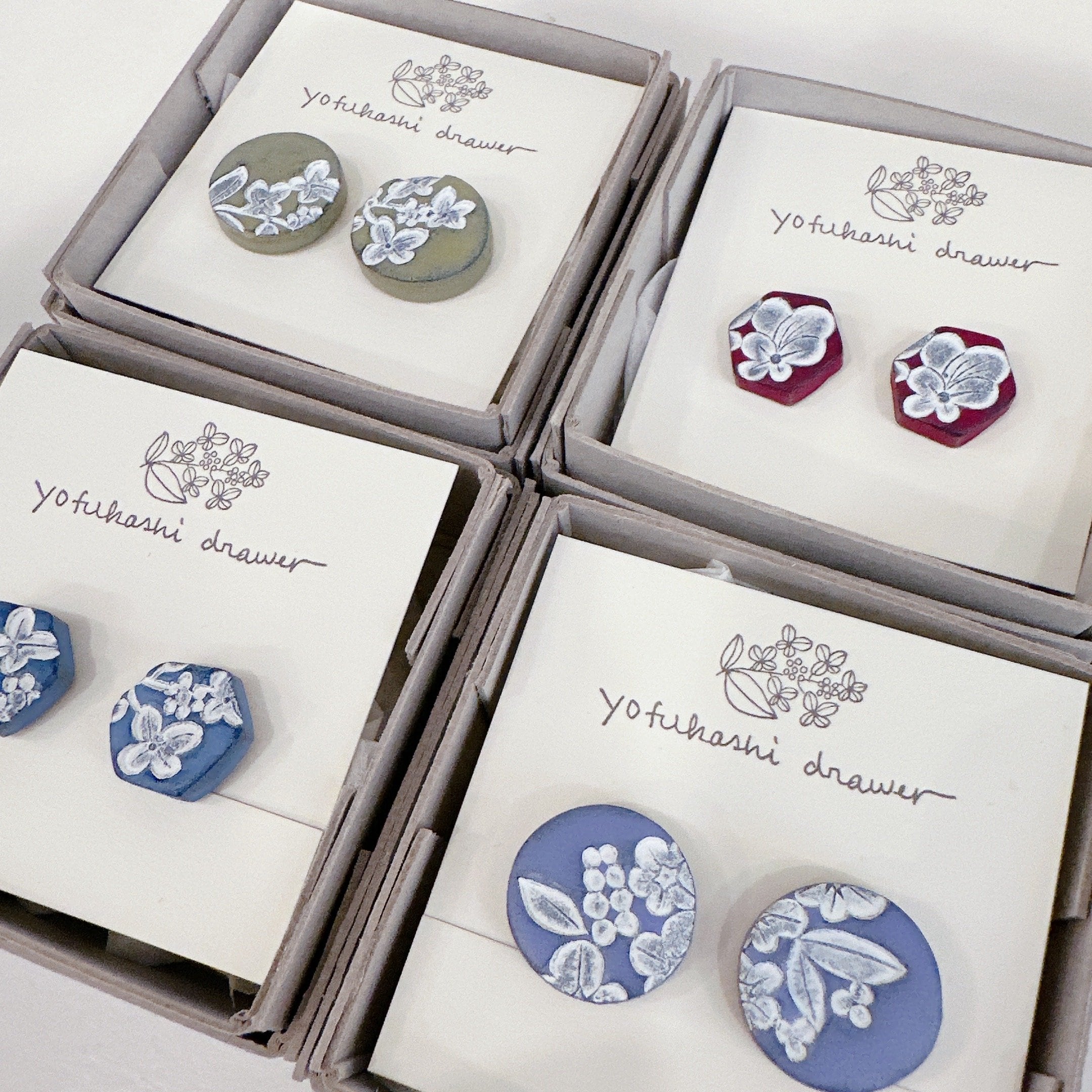 陶土に消しゴムはんこで凹凸模様をつけた作品を制作されているyofukashi drawer さんから、耳飾り入荷しました