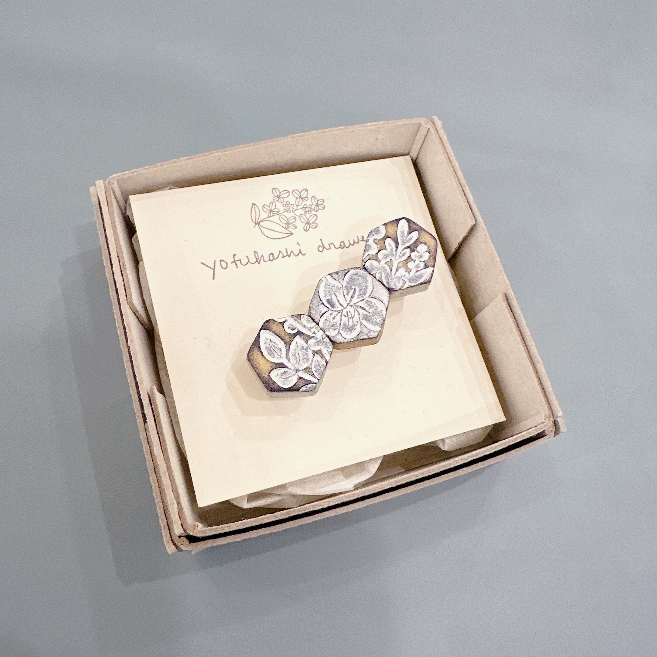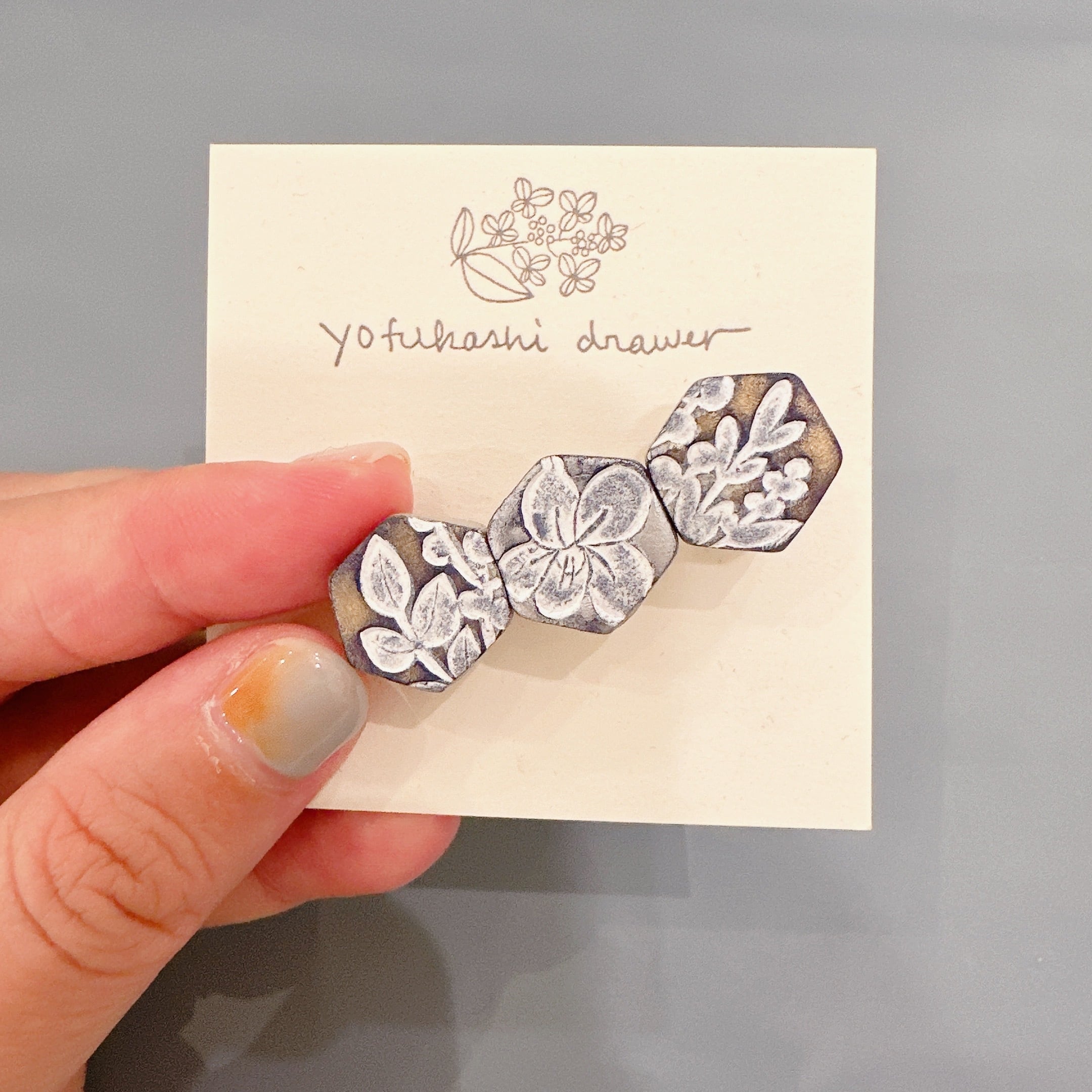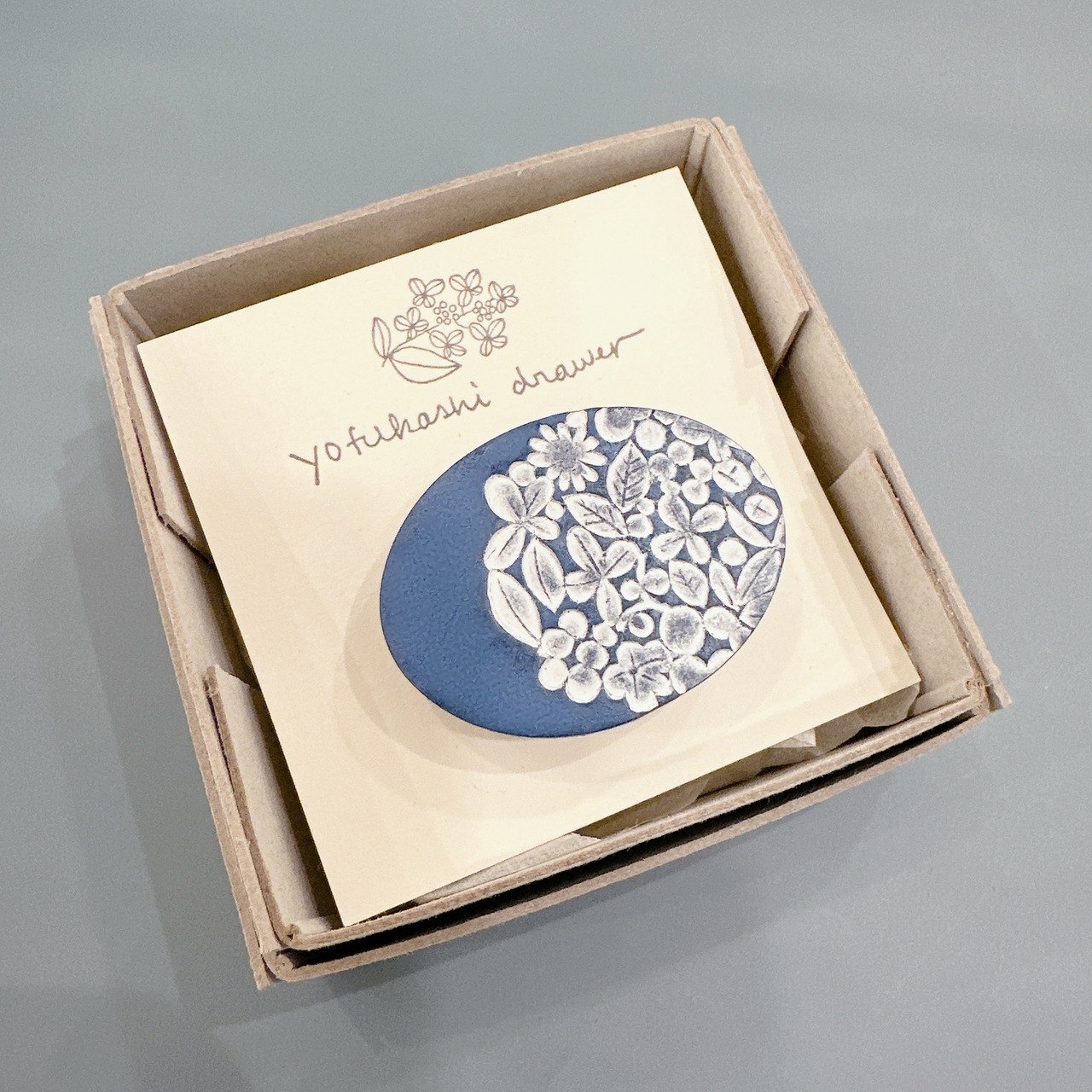 陶土に消しゴムはんこで凹凸模様をつけた作品を制作されているyofukashi drawer さんから、ブローチたくさん入荷しました