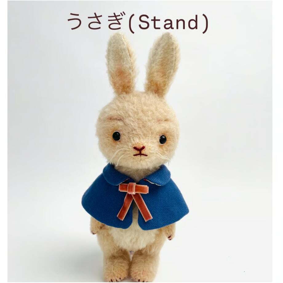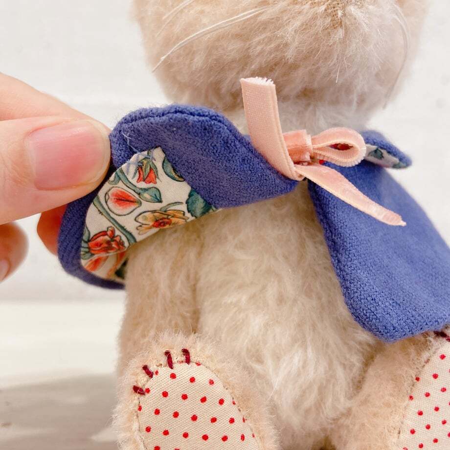今回自立する子は初めてです。うさぎの生地、手足のパッド、ケープは元ある色に薄ら茶色に染めて雰囲気のある生地にしました。