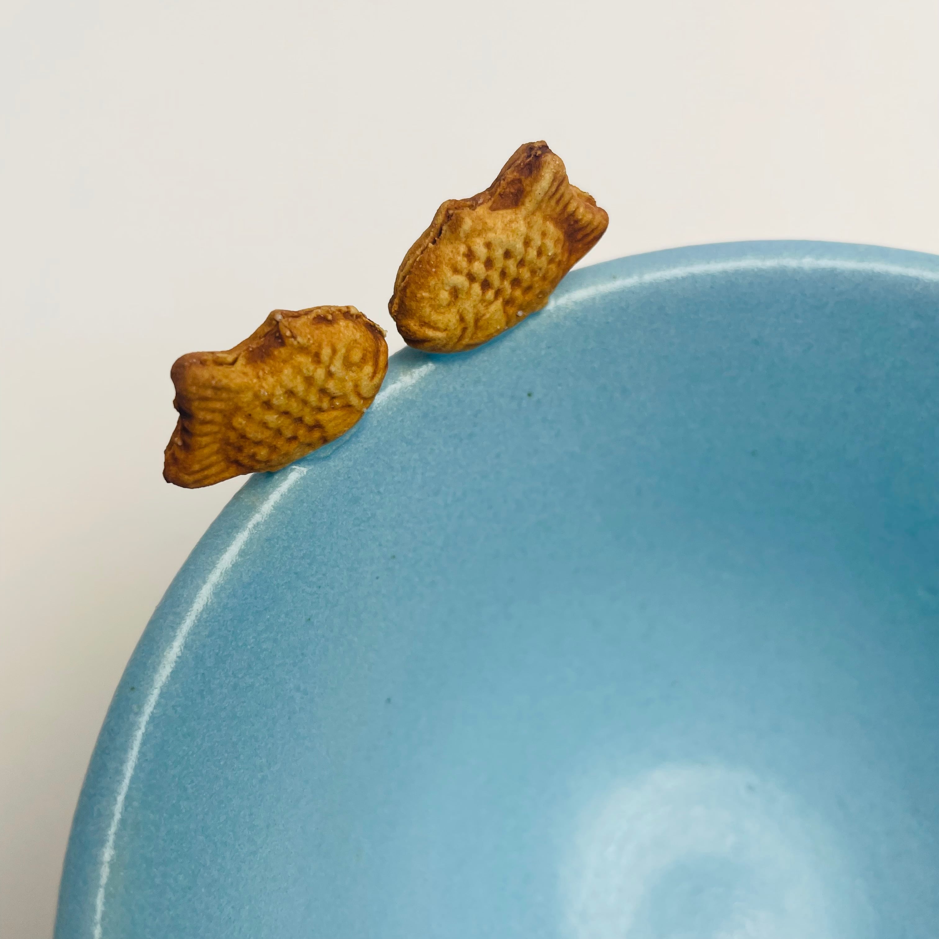 陶器製のタイヤキです。粘土を型に押して成形して、 陶芸用の絵具で焦げ目を着色して焼いています。