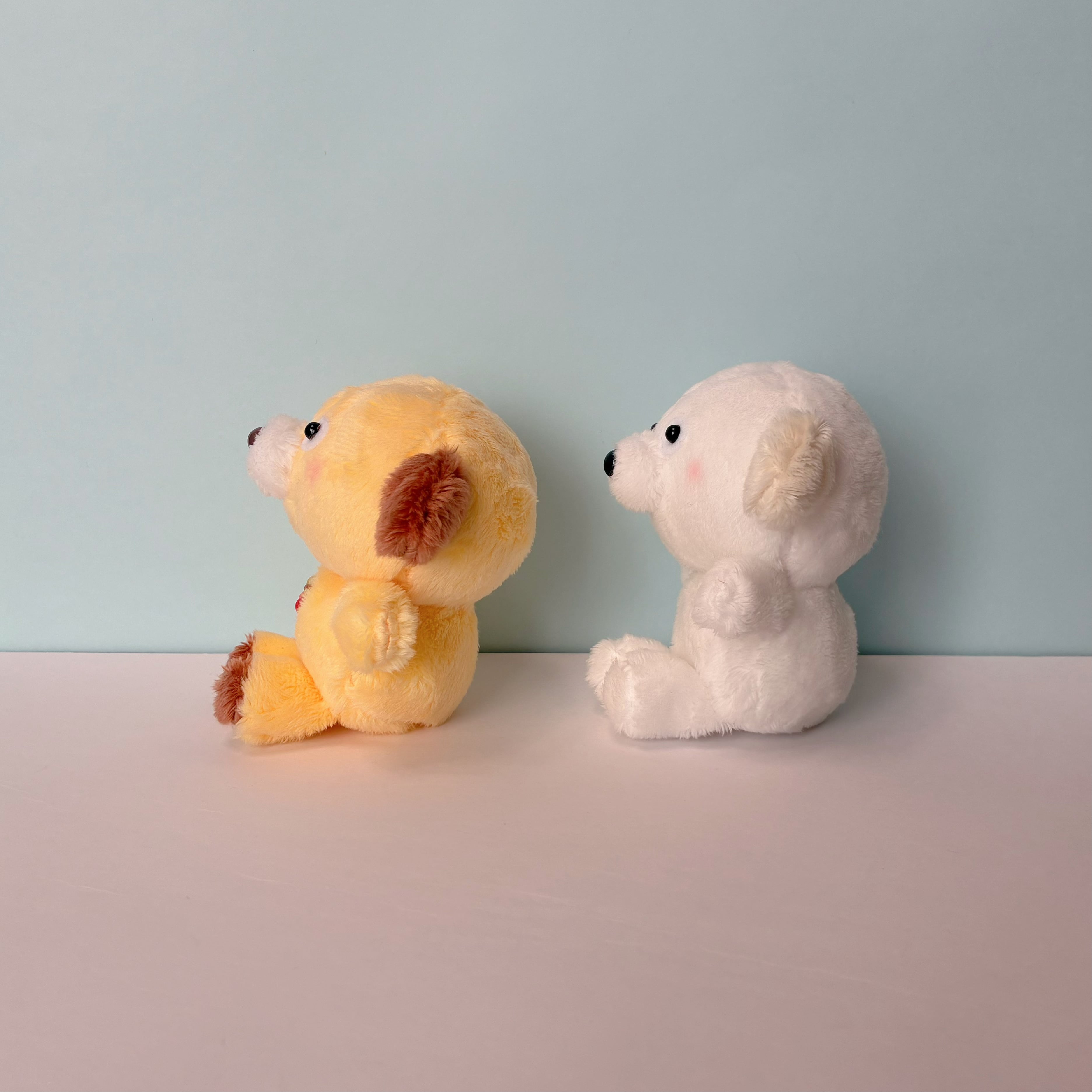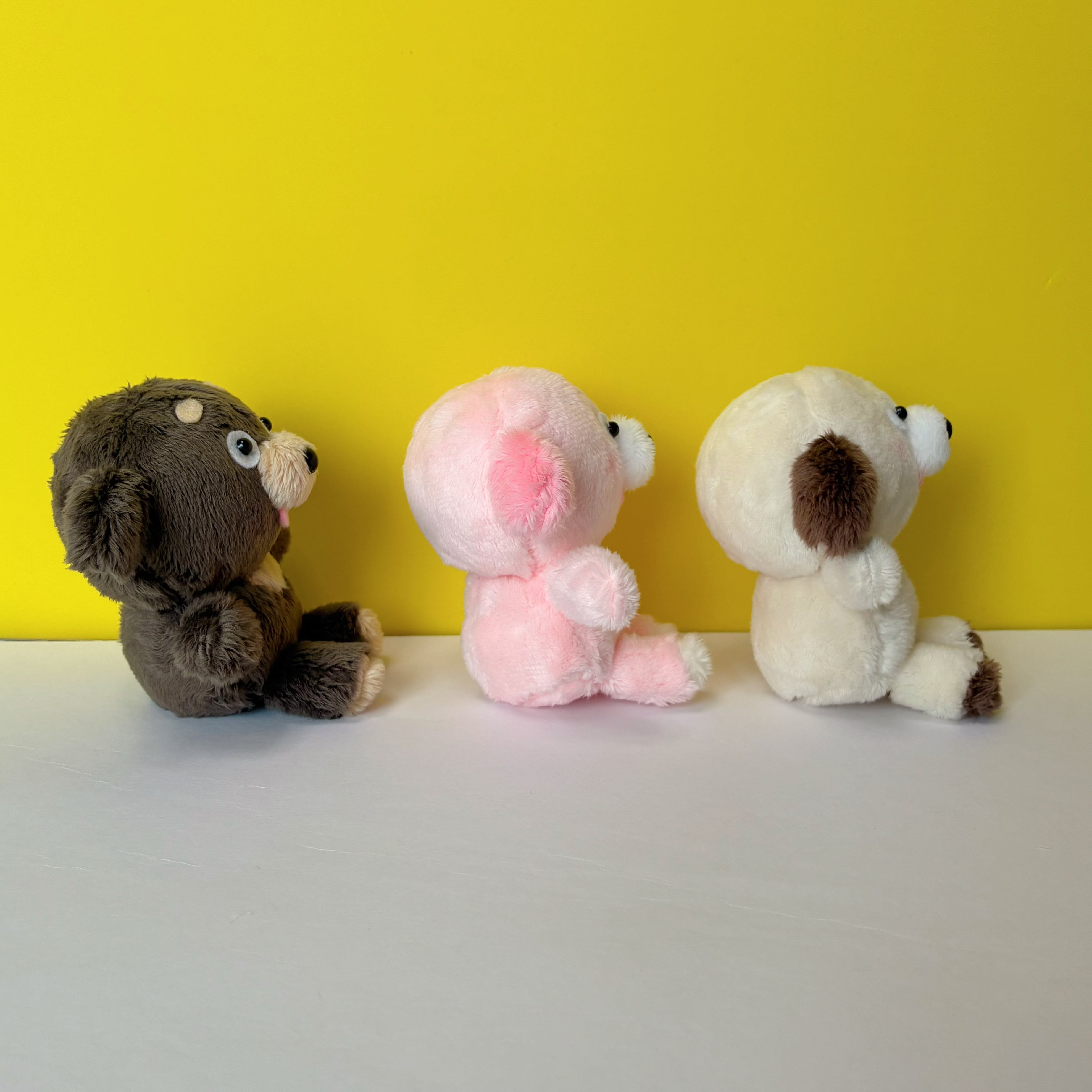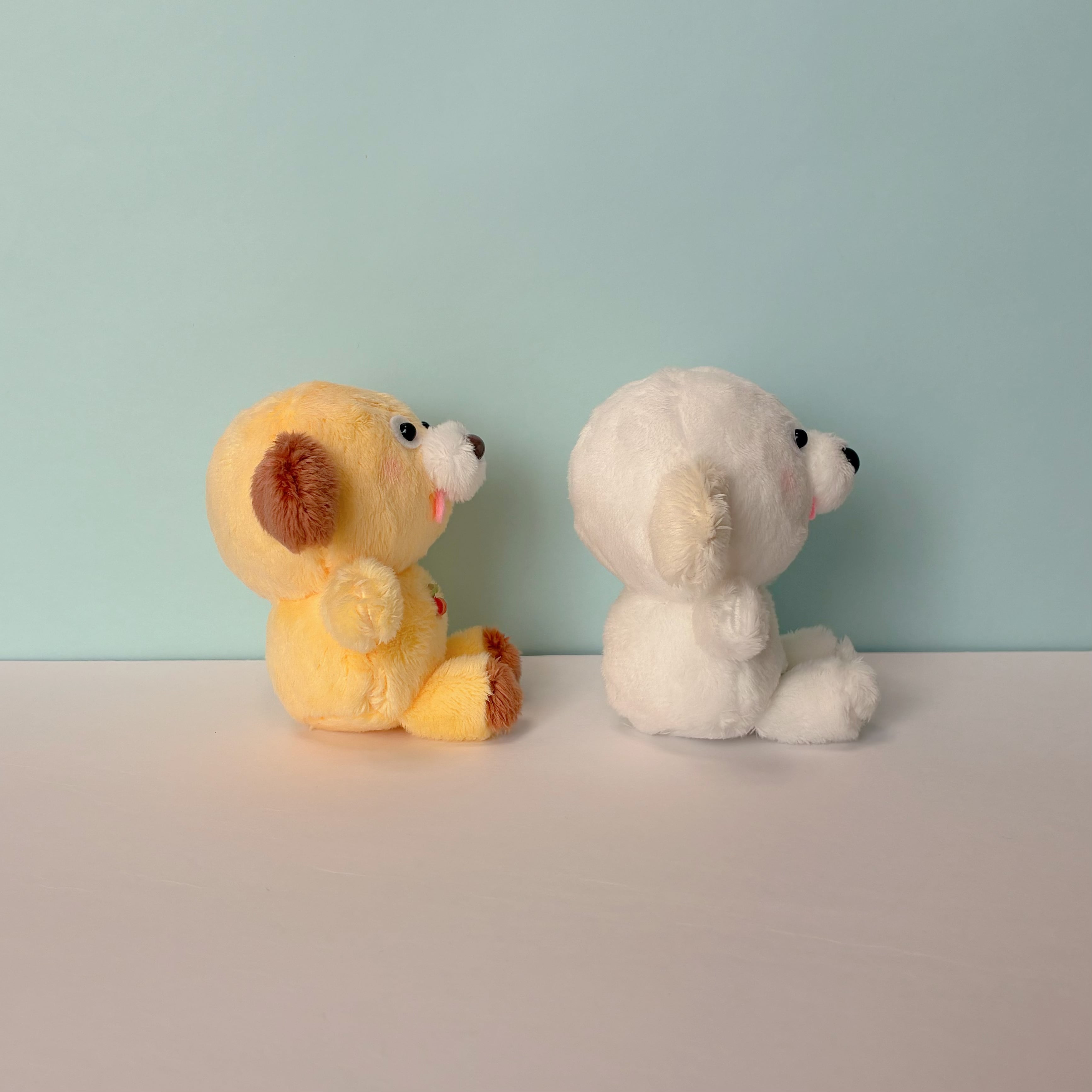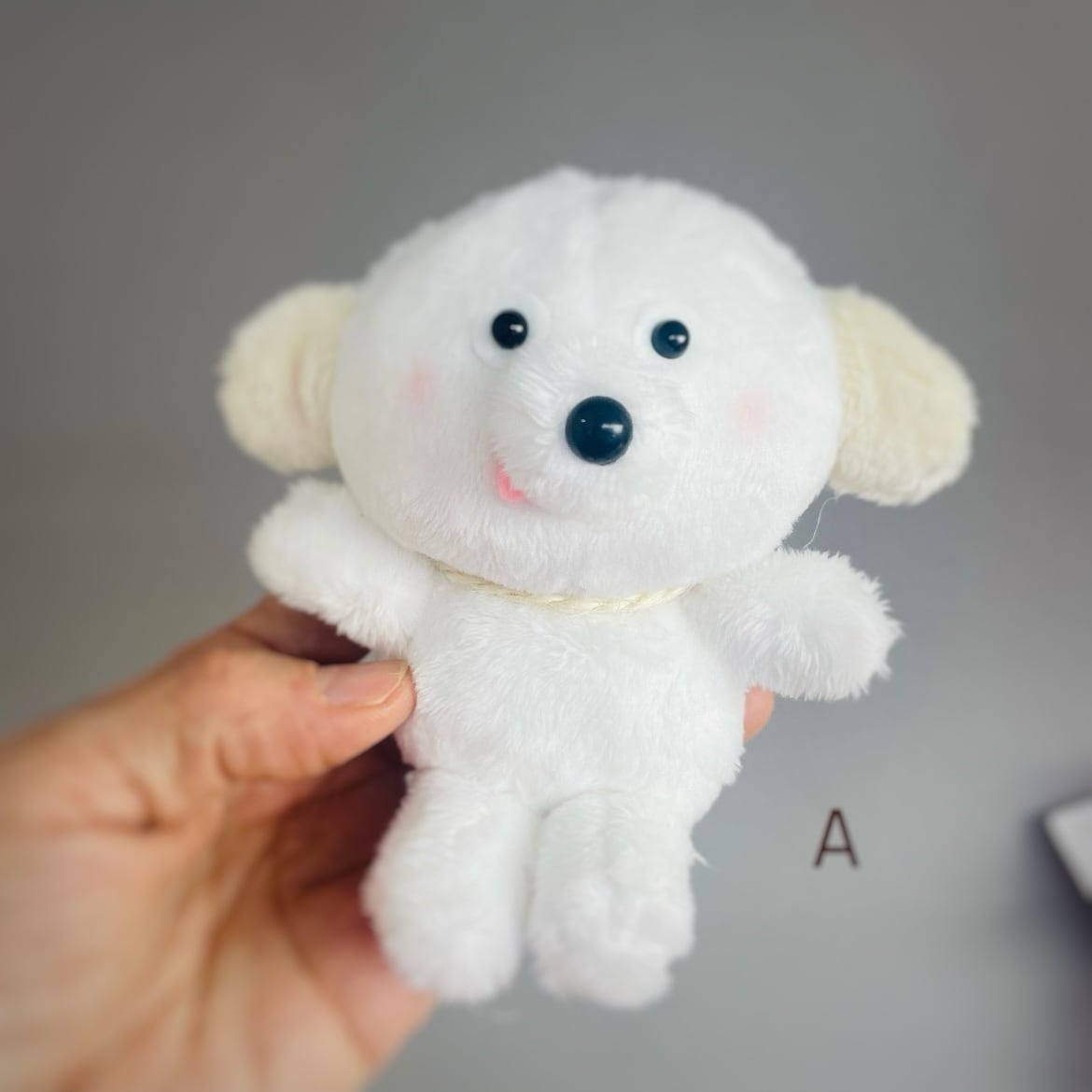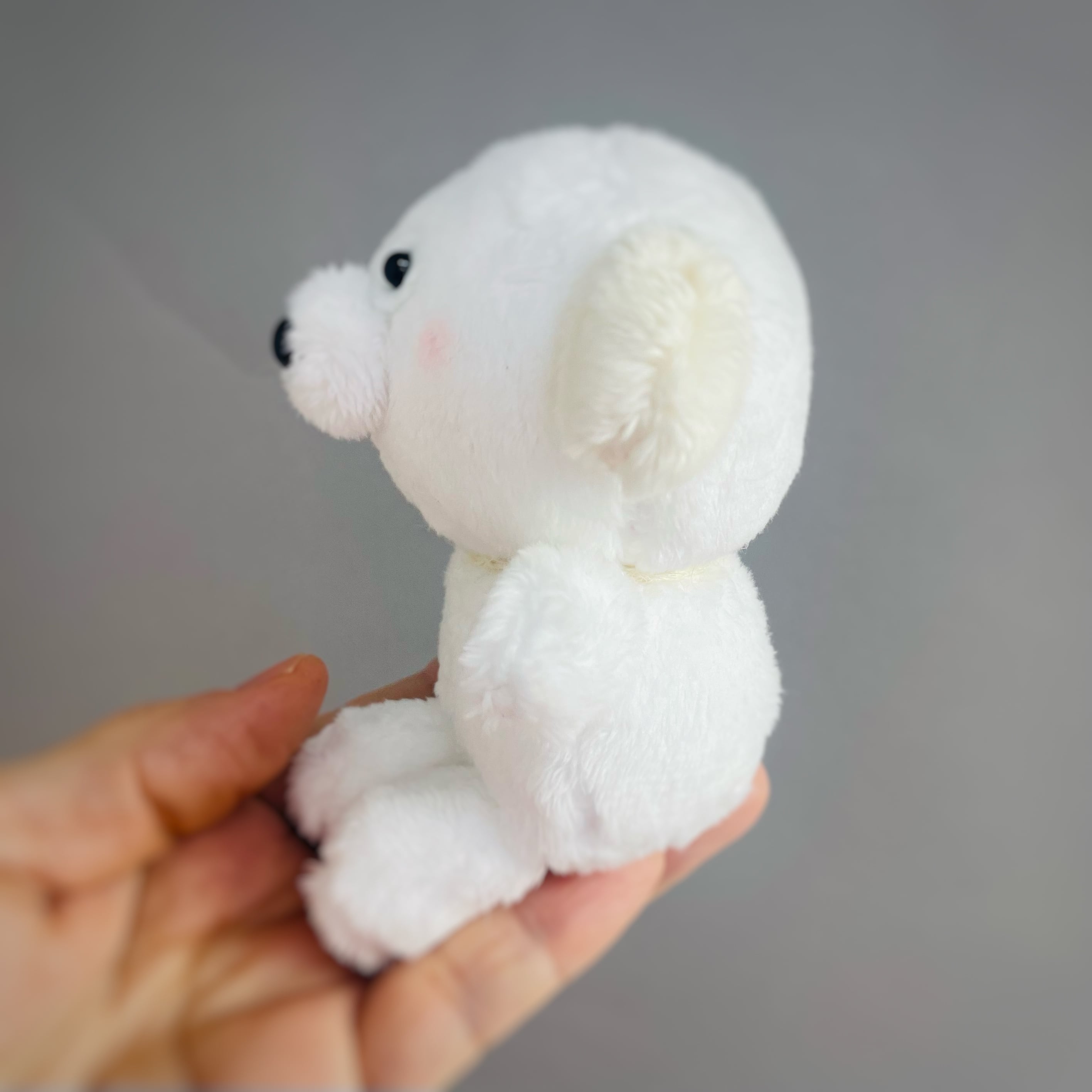 どこかおとぼけた表情の、 白い犬のぬいぐるみです。