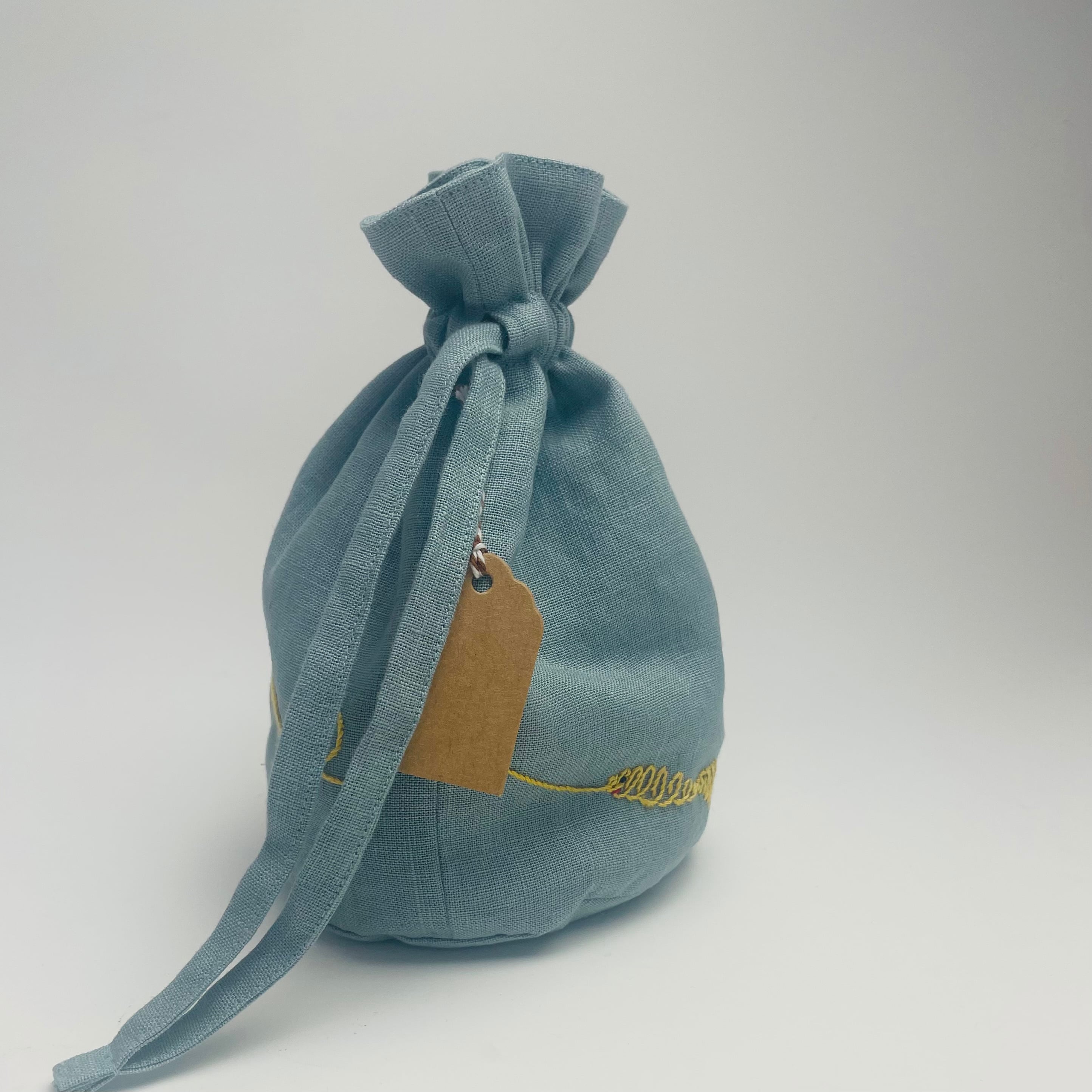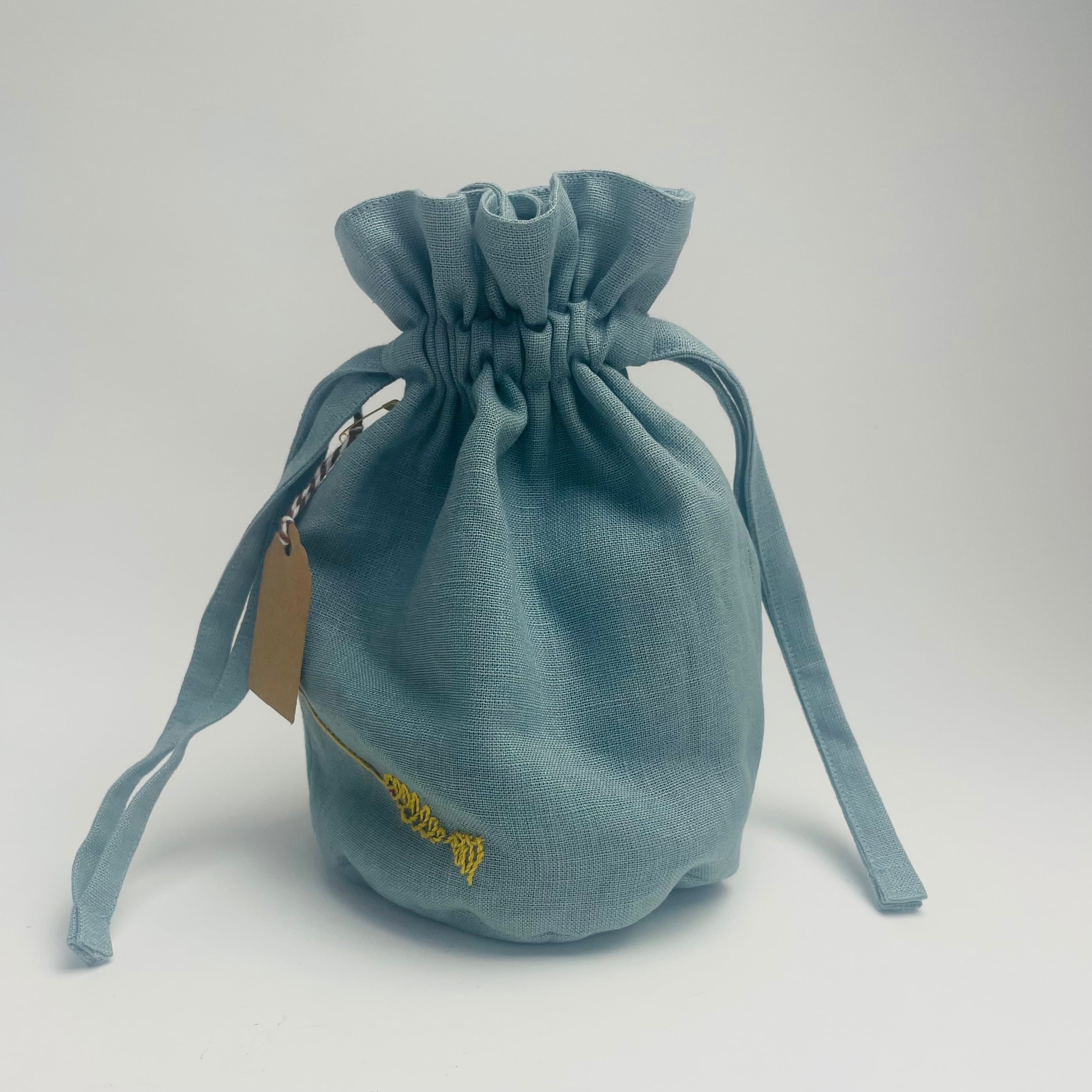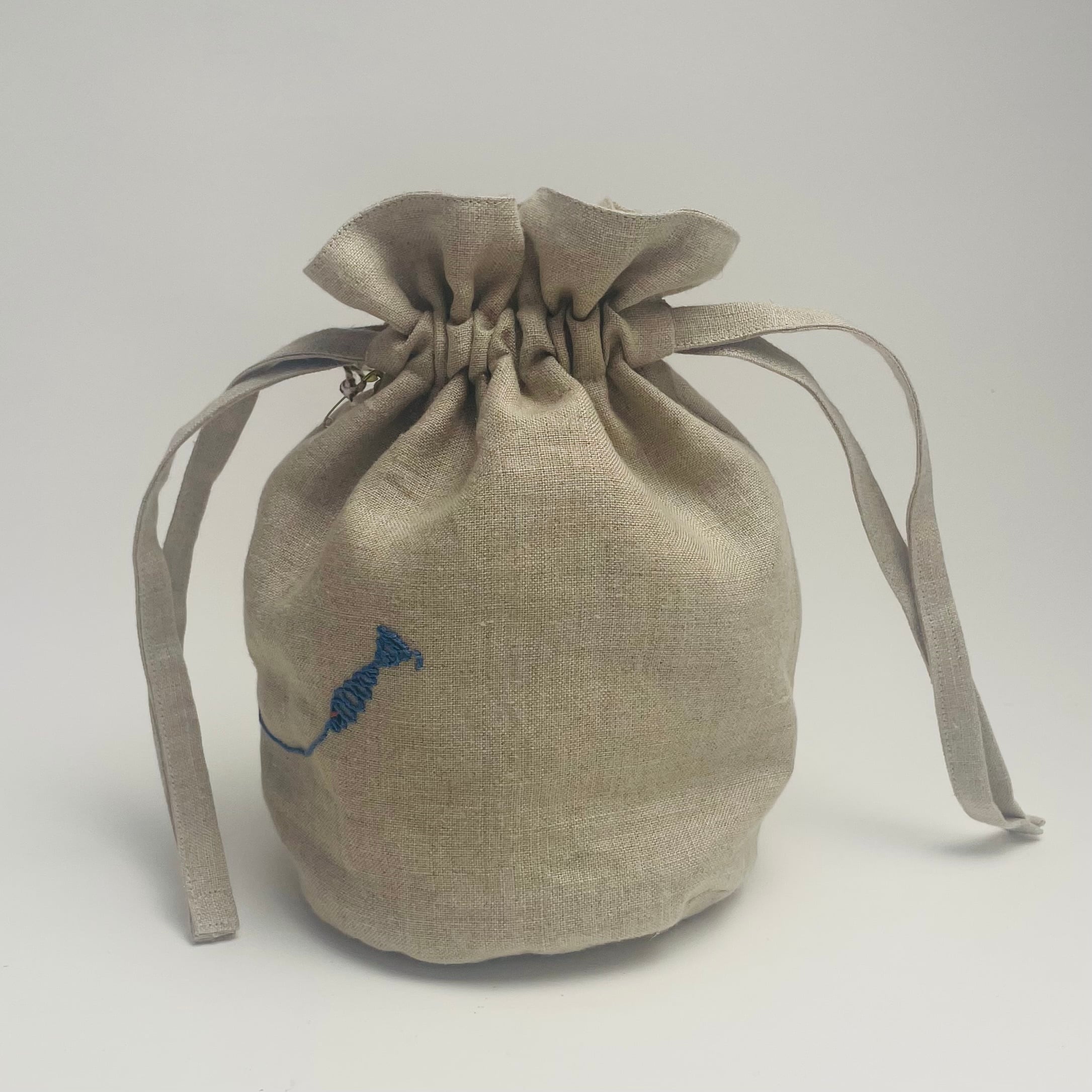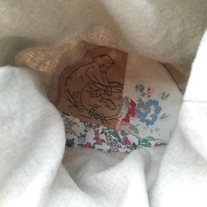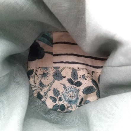 ひもも内布も共にリネンですが、中の底が 花柄のコットンをぬい合わせたパッチワーク風になって ます、中も可愛い丸底巾着です。
