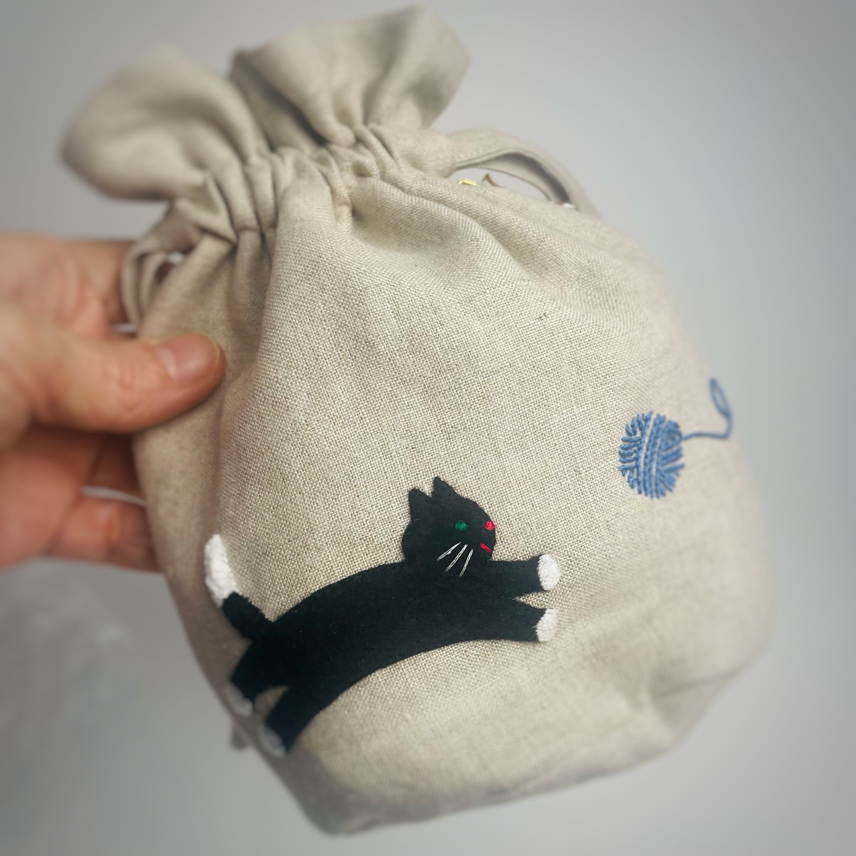 【ねこと毛糸玉 丸底巾着】横約18㎝・縦18㎝・丸底直径約11㎝
