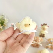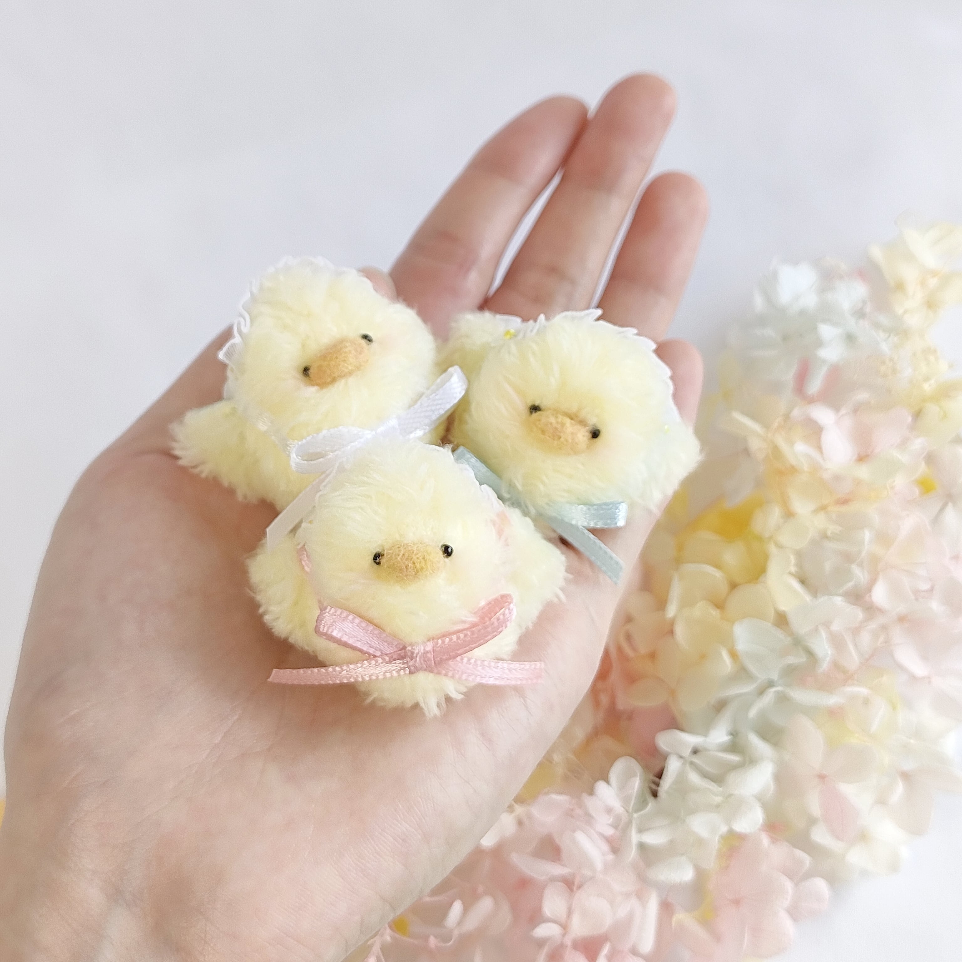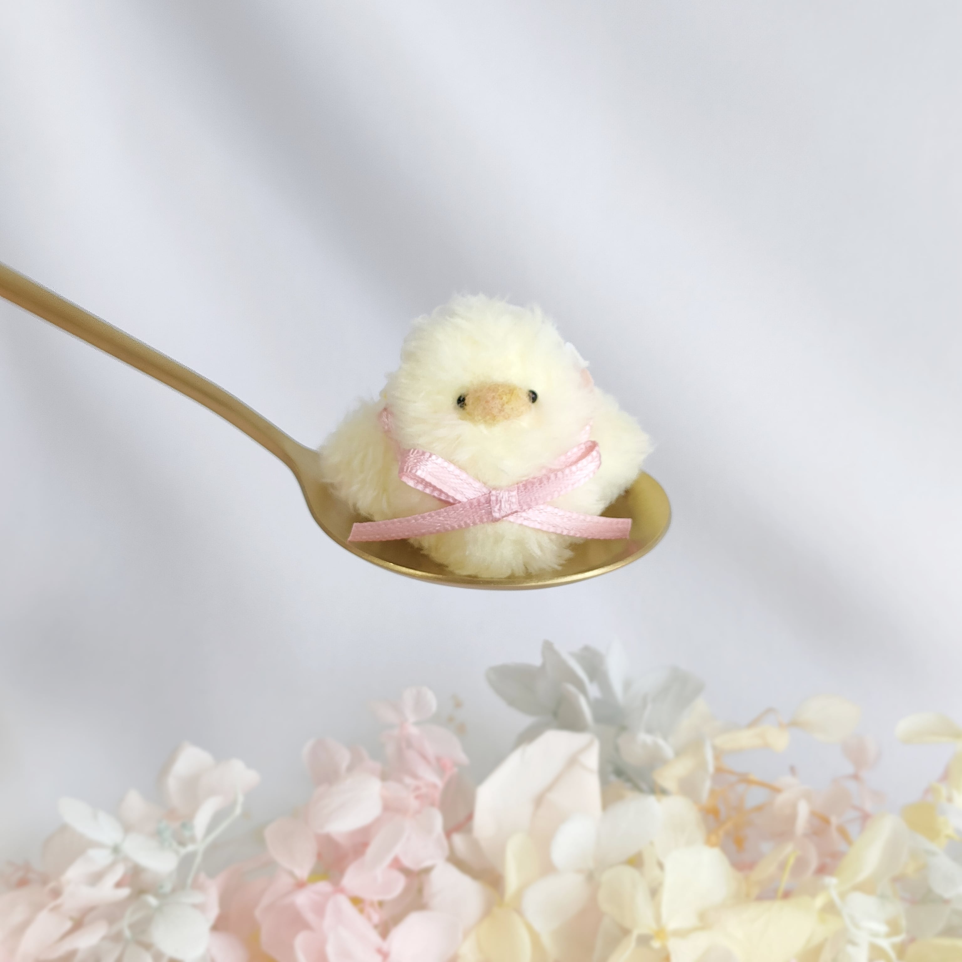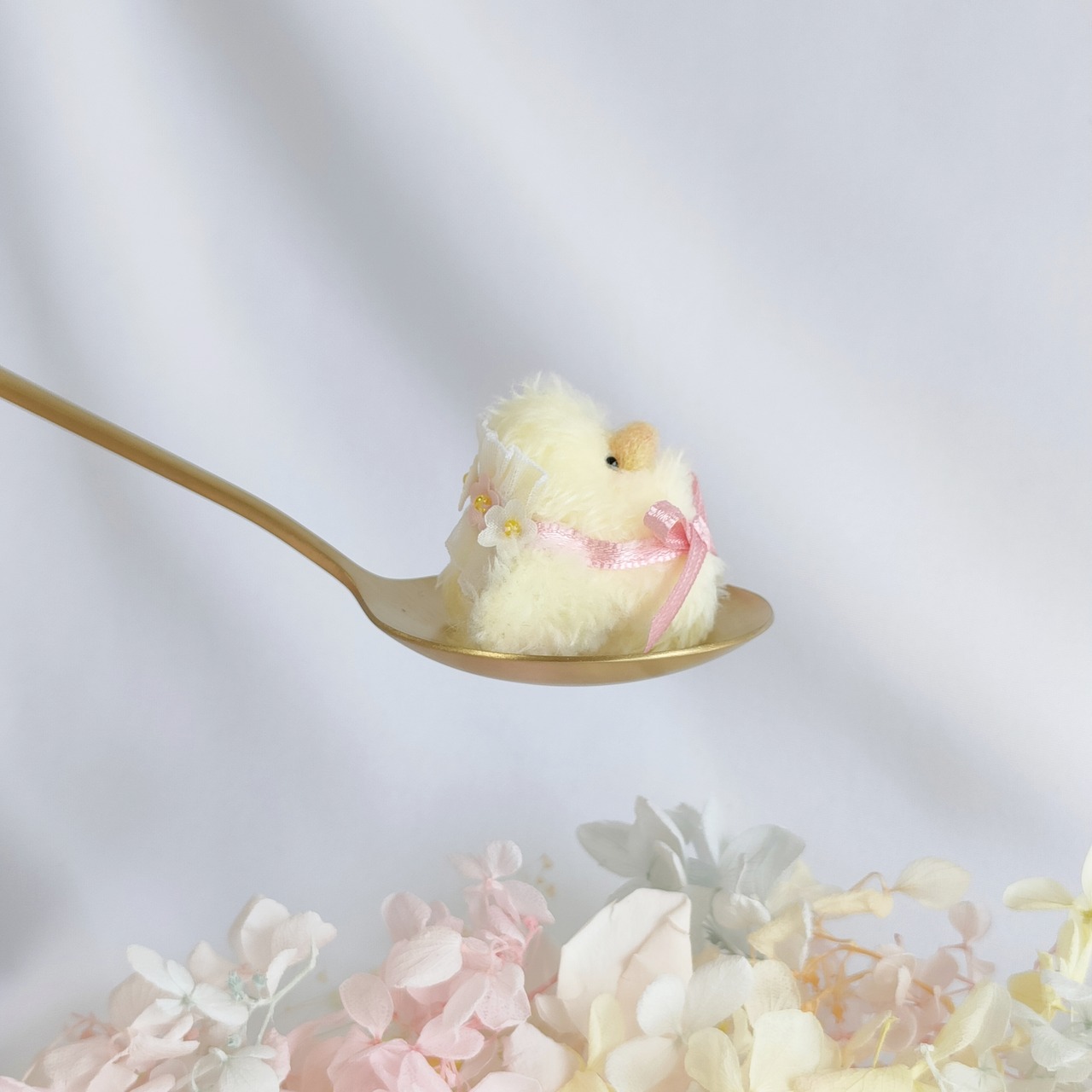 まあるいフォルムが愛らしい、ちいさなひよこちゃん。お花のヘッドレスで可愛くおめかししました。羽の裏の花柄もポイントです。