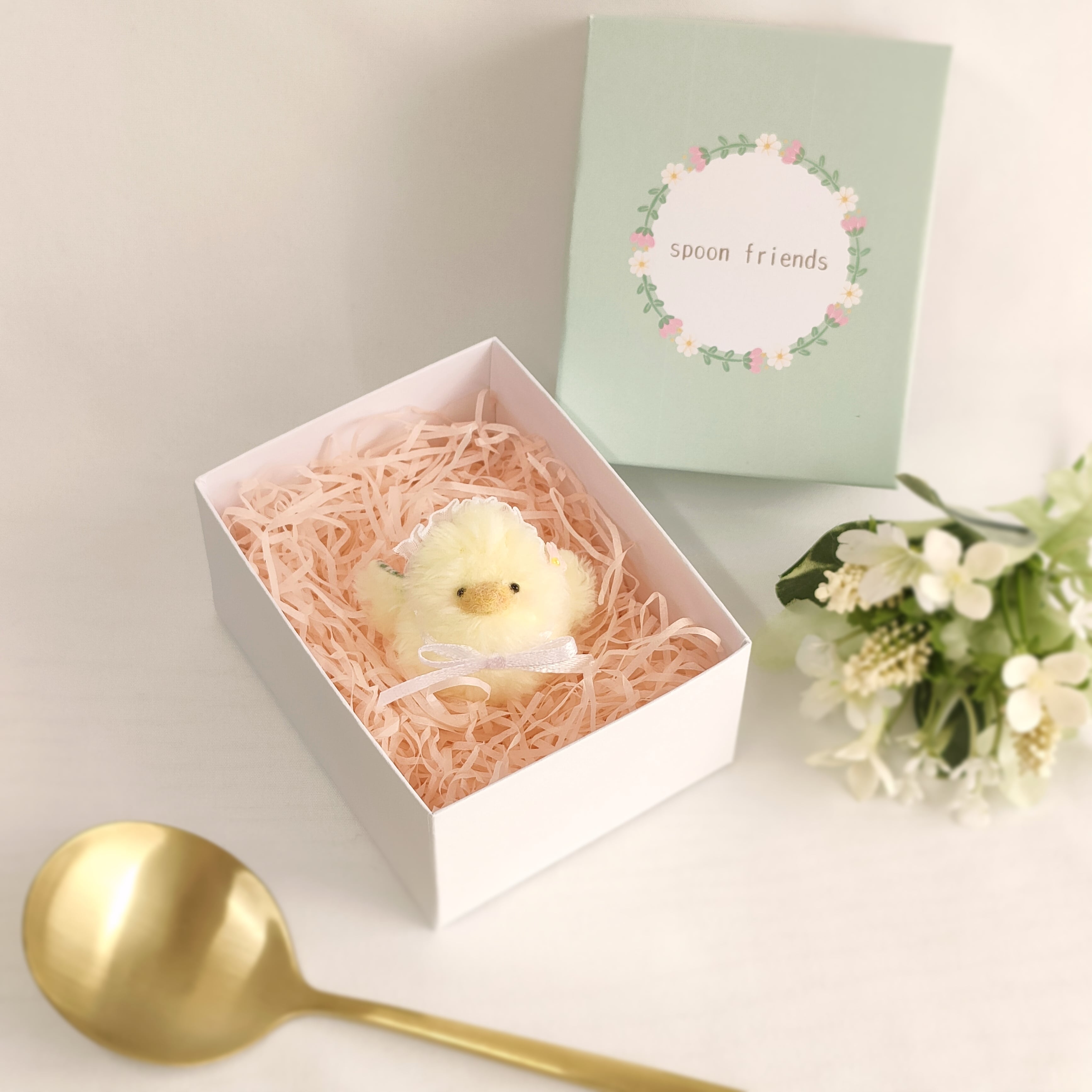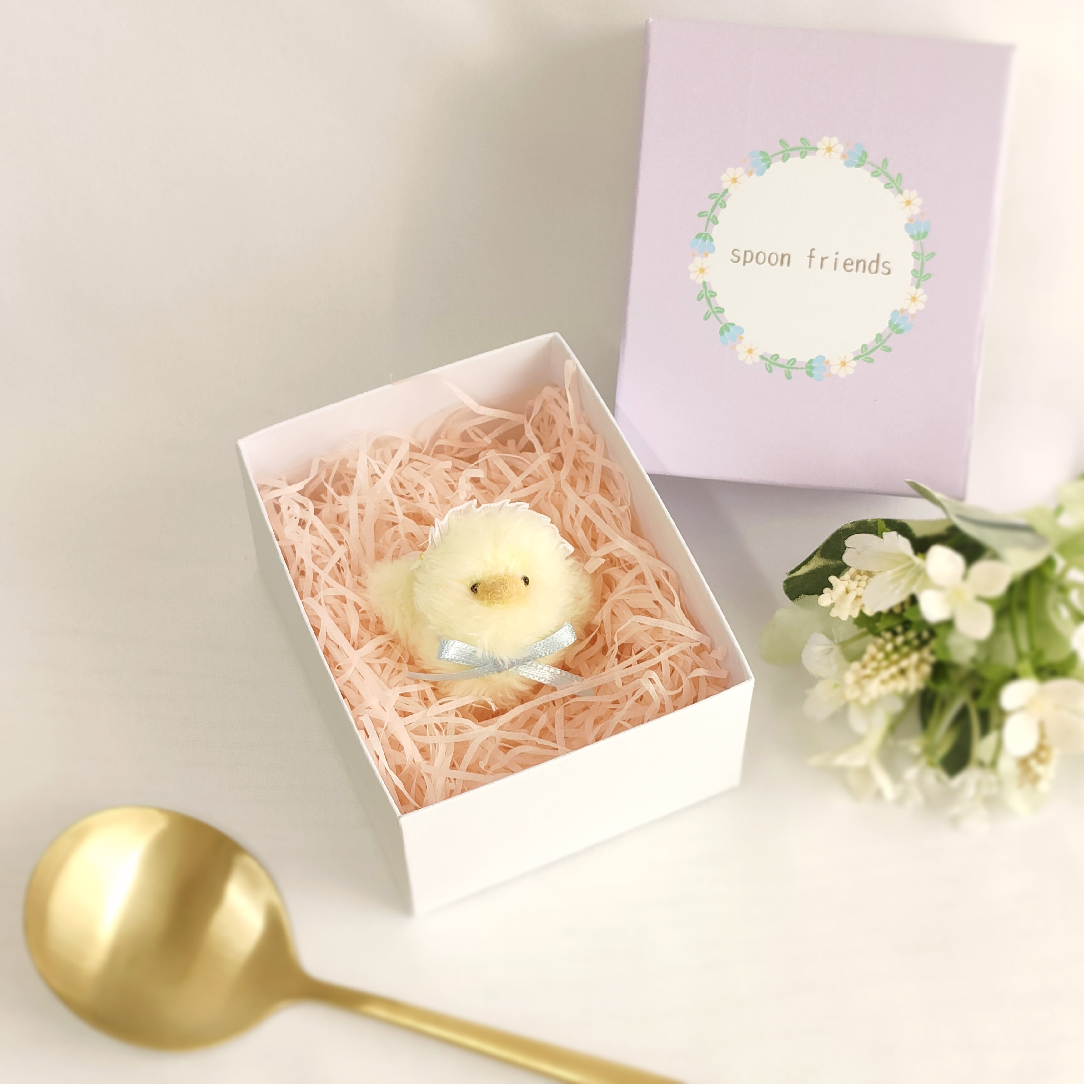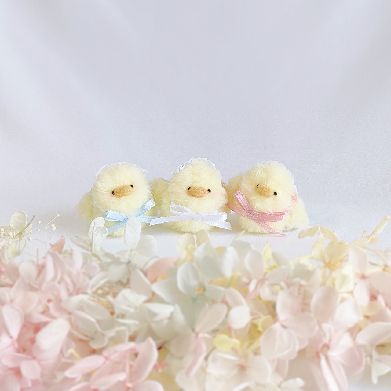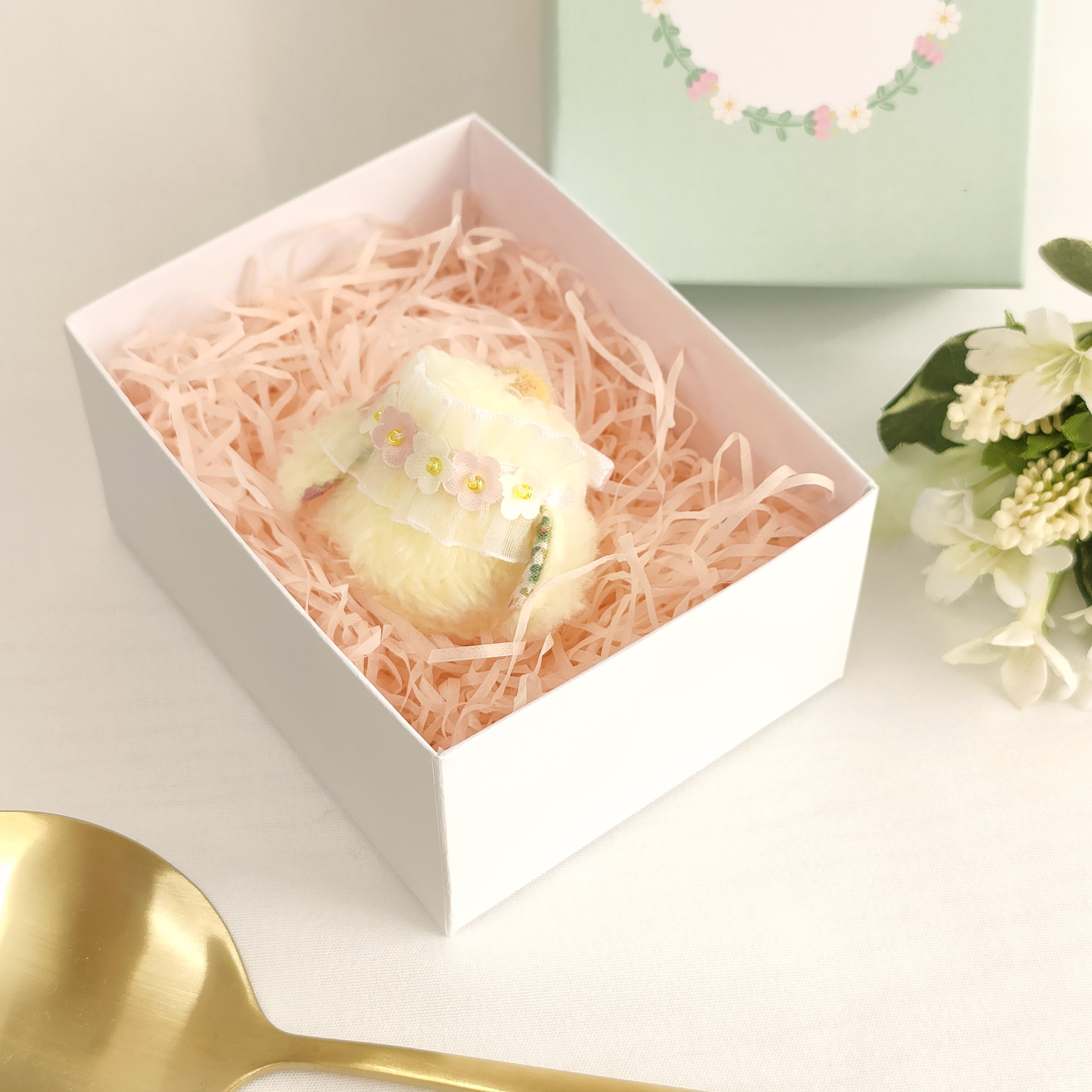 まあるいフォルムが愛らしい、ちいさなひよこちゃん。お花のヘッドレスで可愛くおめかししました。羽の裏の花柄もポイントです。