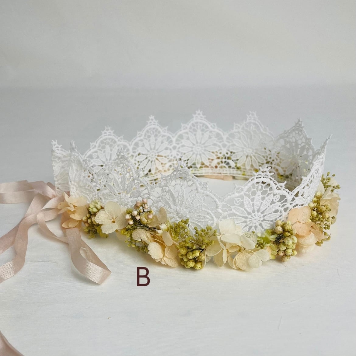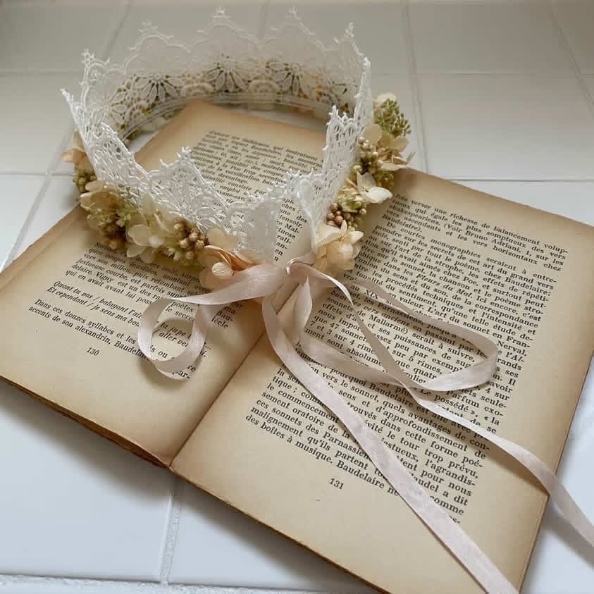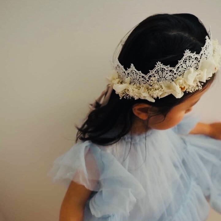 レースのティアラにプリザーブドフラワーを付けて 花かんむりに仕上げました。