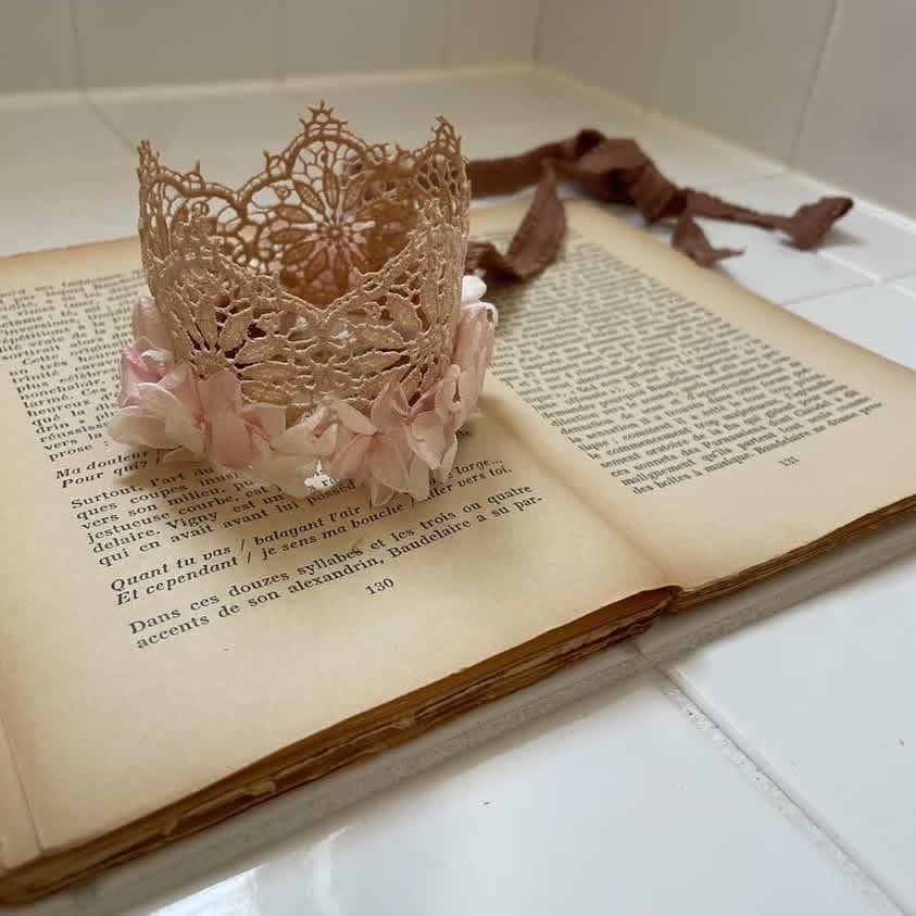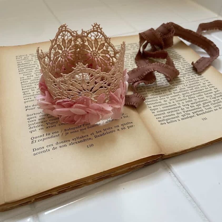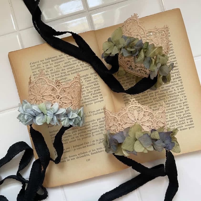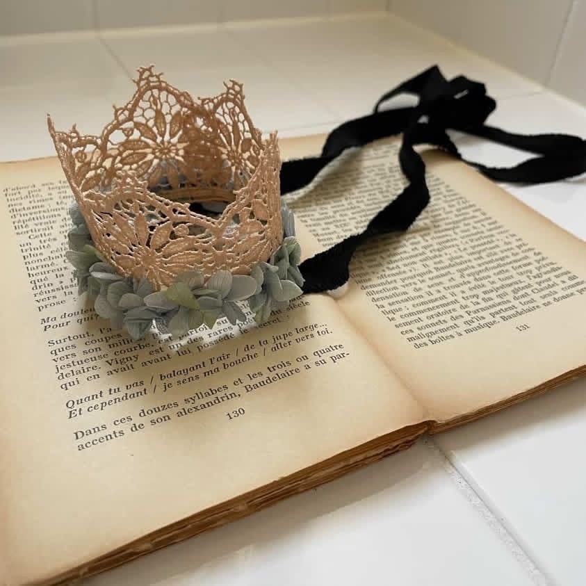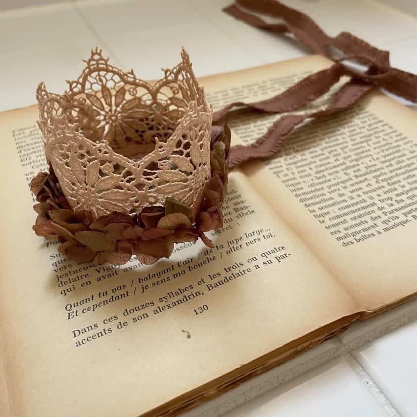 紅茶染めしたレースにあじさいでおめかししたアンティークな雰囲気のクラウンです。