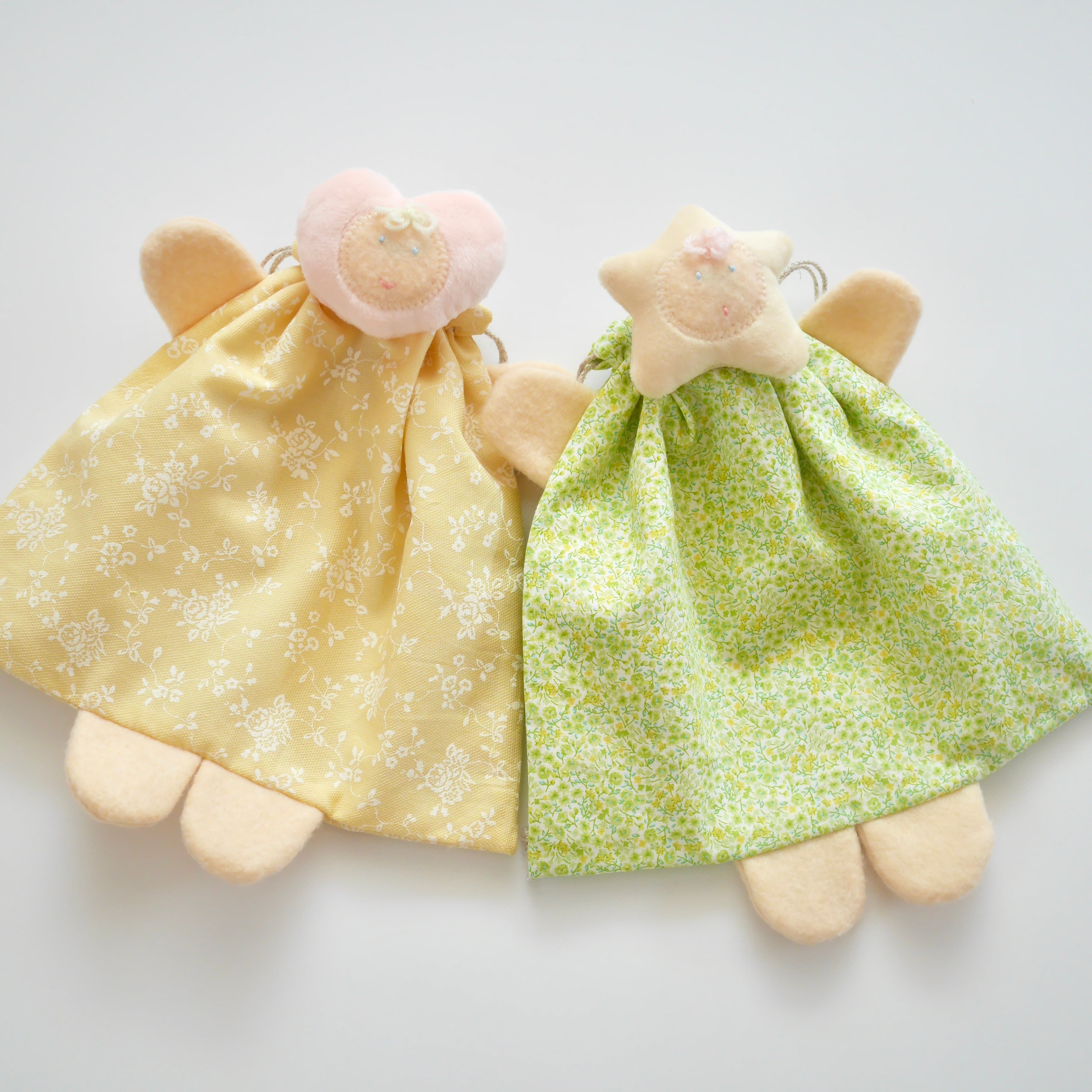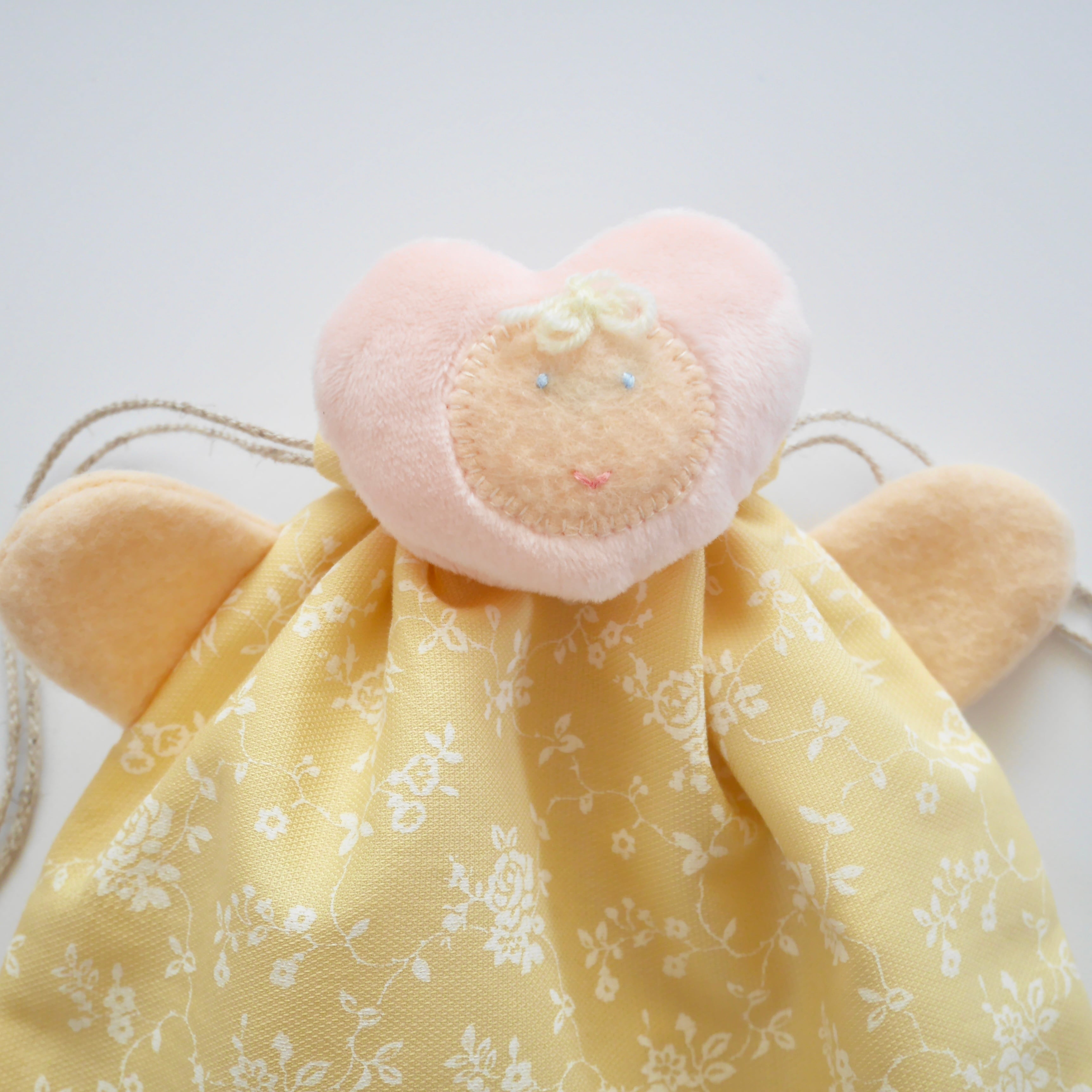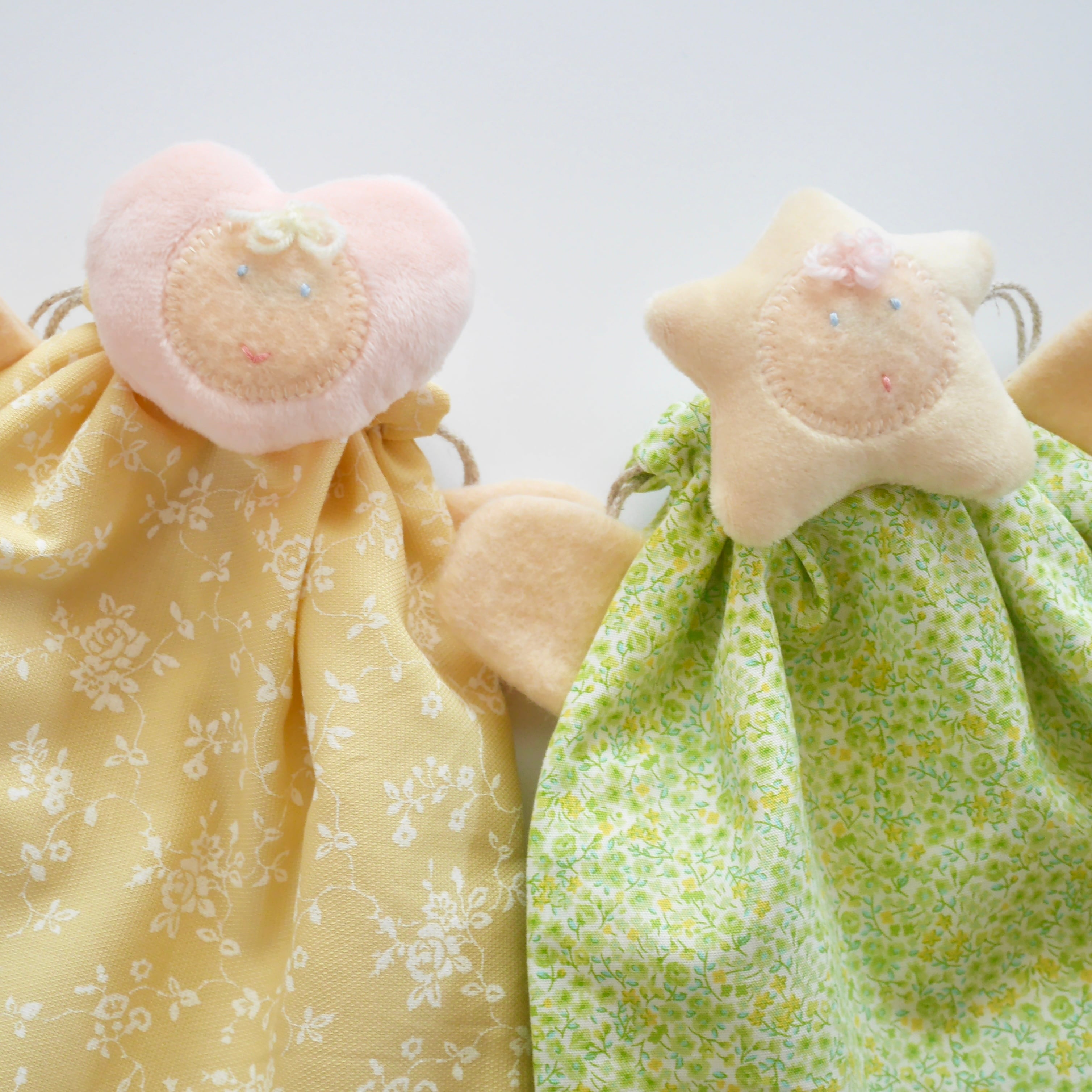 きゅっと絞ると、ワンピースを着たハートと星の妖精さんになる巾着袋です。